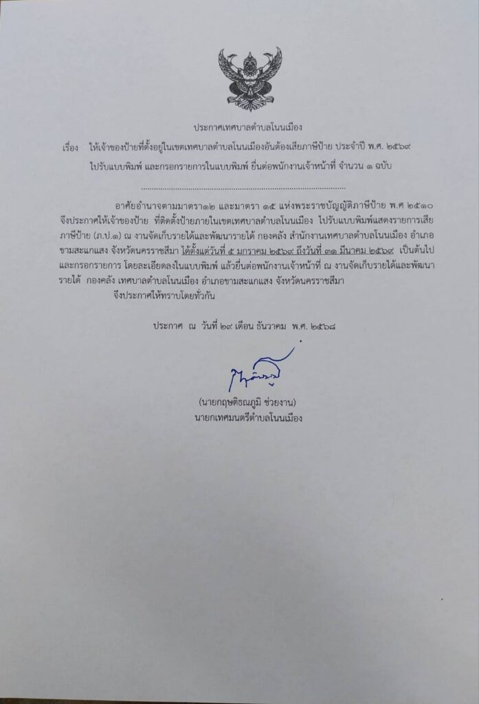 เรื่อง ให้เจ้าของป้ายที่ตั้งอยู่ในเขตเทศบาลตำบลโนนเมืองอันต้องเสียภาษีป้าย ประจำปี พ.ศ.2569 ไปรับแบบพิมพ์ และกรอกรายการในแบบพิมพ์ ยื่นต่อพนักงานเจ้าหน้าที่ จำนวน 1 ฉบับ