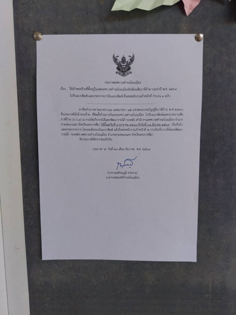 เรื่อง ให้เจ้าของป้ายที่ต้้งอยู่ในเขตเทศบาลตำบลโนนเมืองอันต้องเสียภาษีป้าย ประจำปี 2568 ไปรับแบบพิมพ์ และกรอกรายการใน